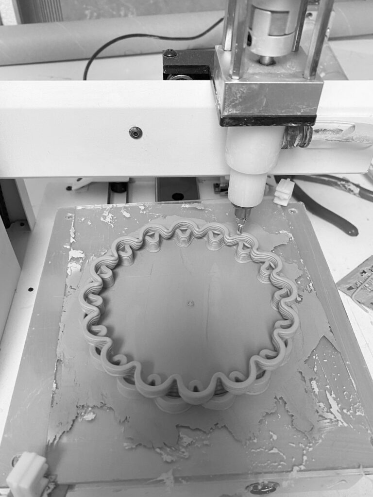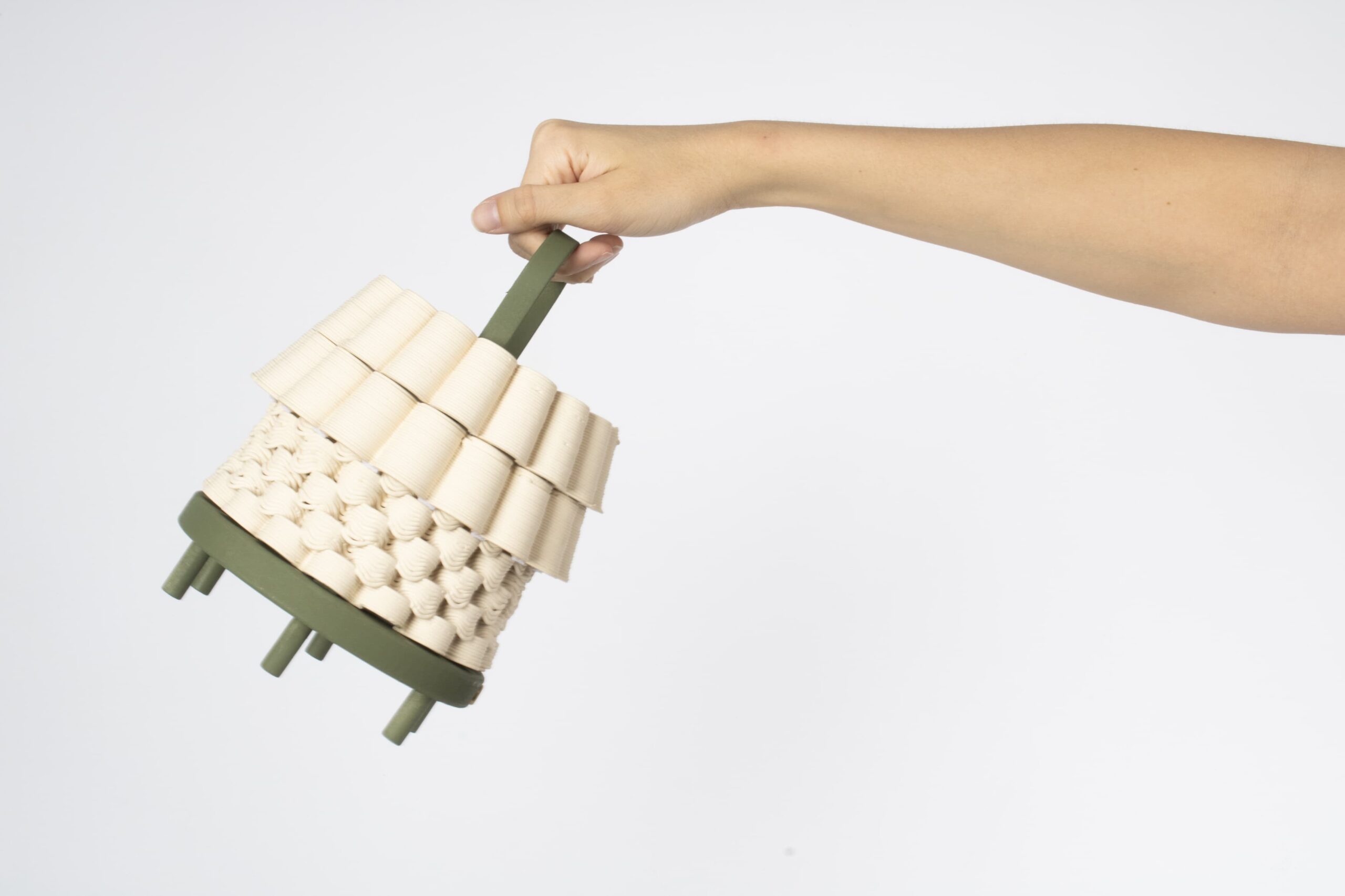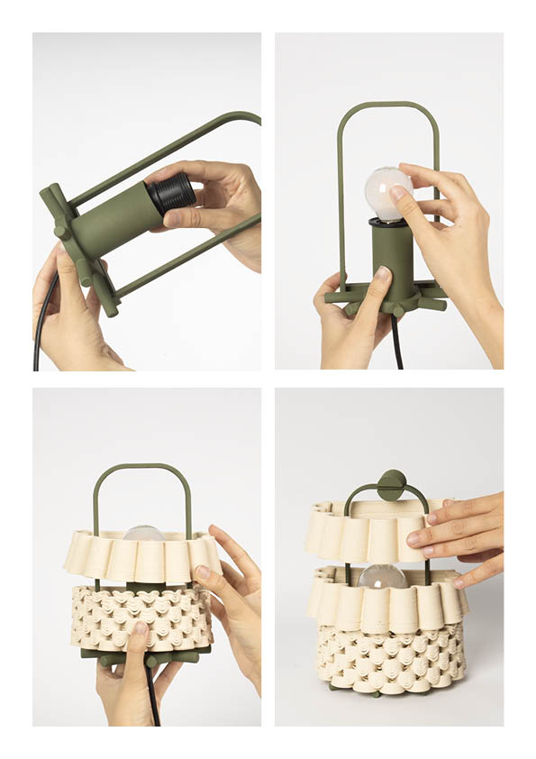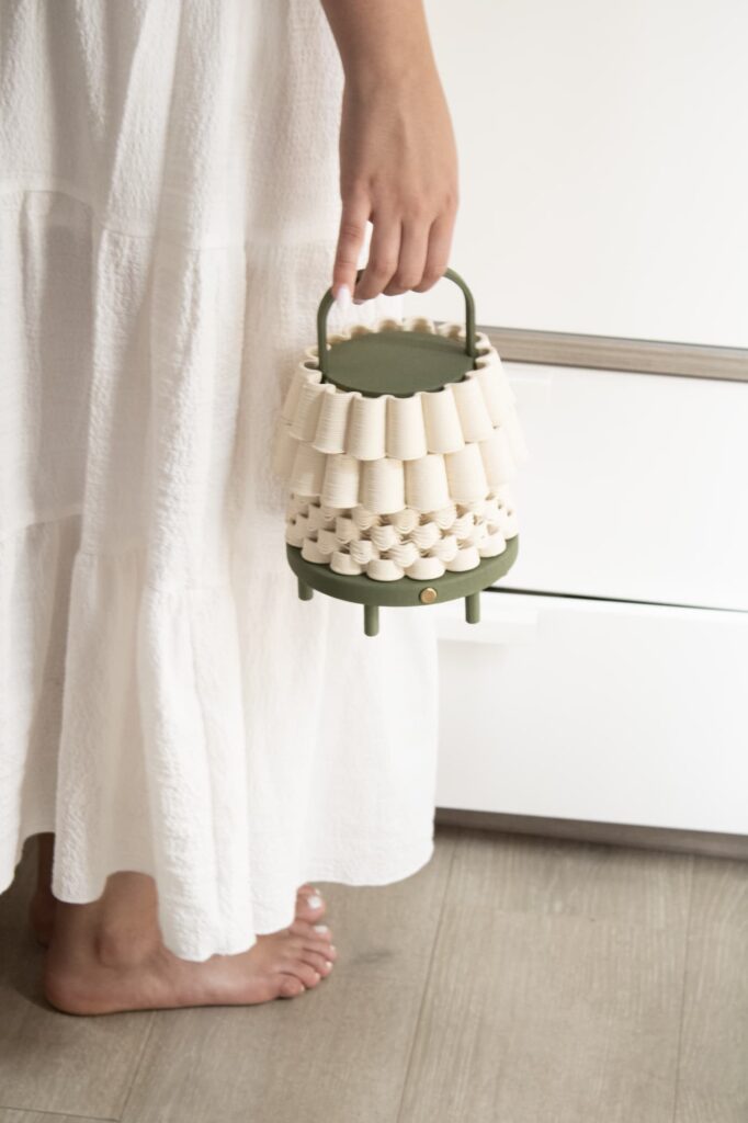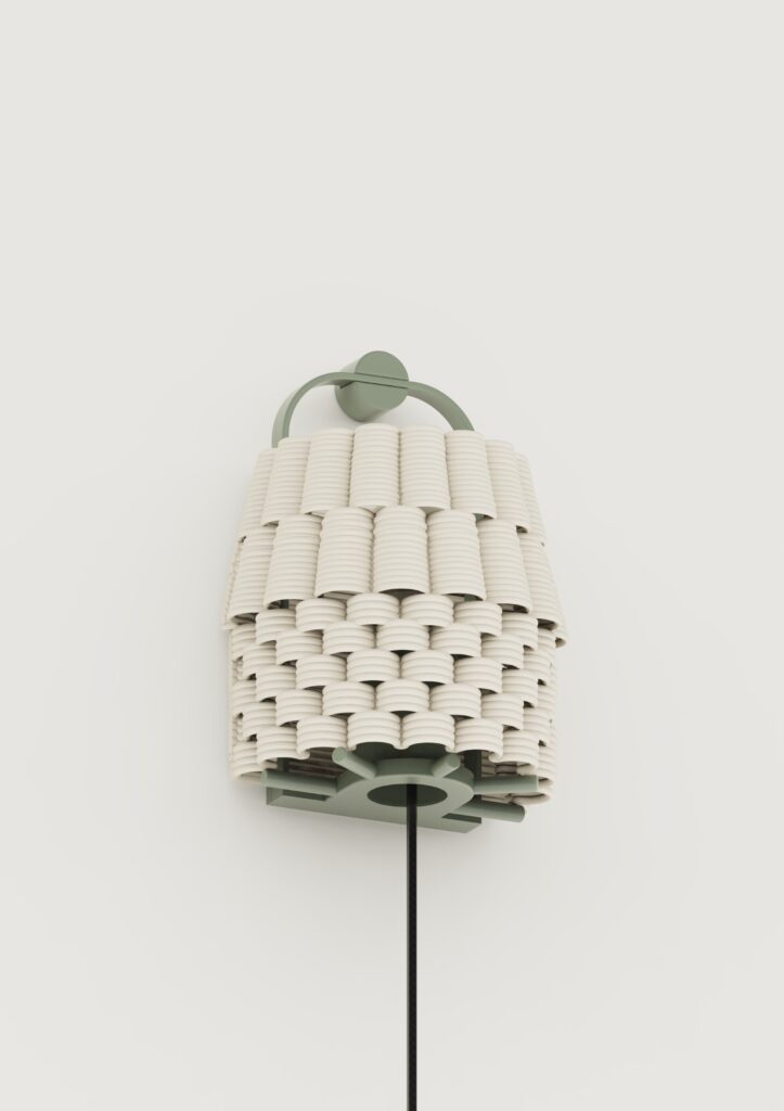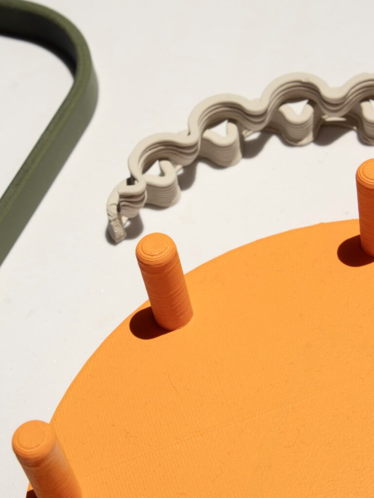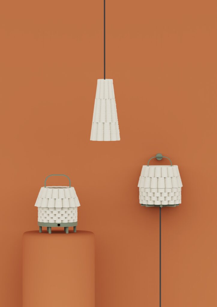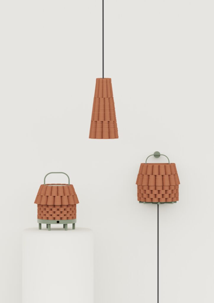 Los materiales buscan traer al interior la sensación de un espacio exterior. El barro en su estado más puro, combinado con piezas de color, genera una sensación cálida y cercana. Los verdes y naranjas recuerdan la terracota de los patios y la vegetación tropical que los rodea, conectando con la luz y el paisaje. Toda la colección está realizada en impresión 3D de cerámica y PLA