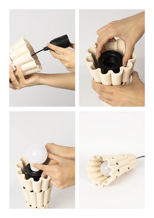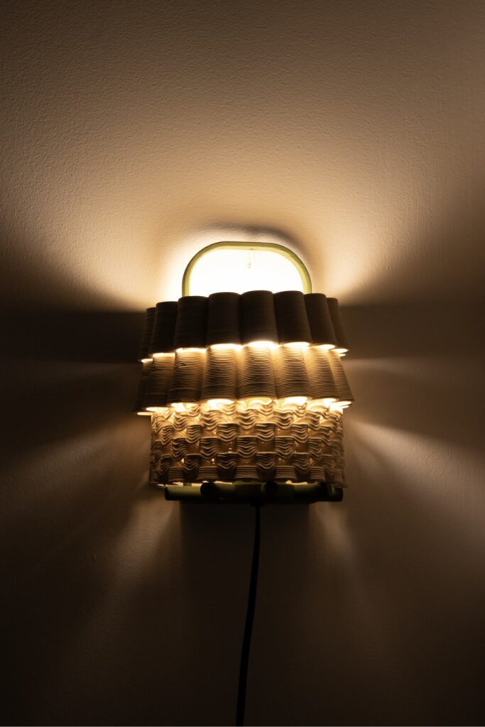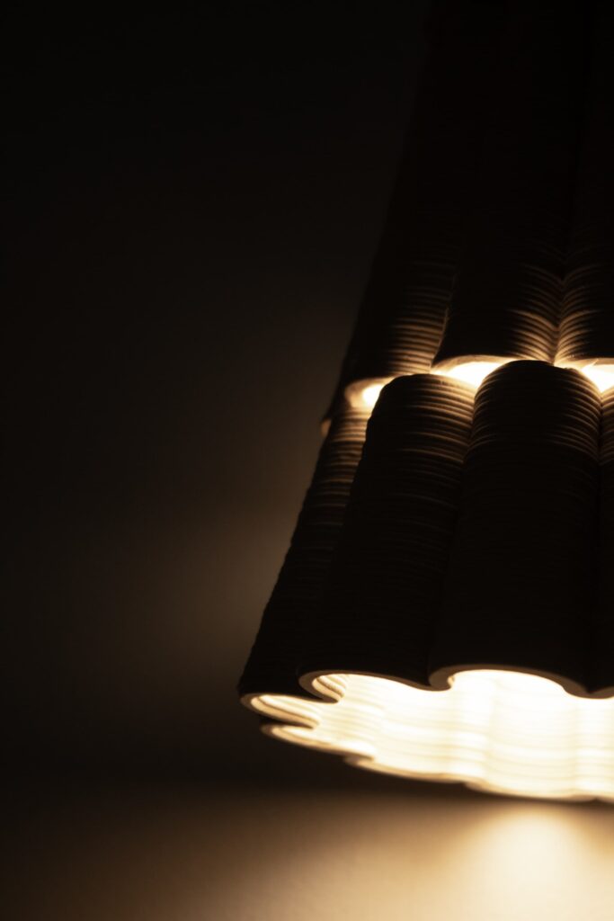 Las superficies ponen énfasis en la filtración lumínica. Así como muchas veces en la arquitectura de climas cálidos se diseña para filtrar la luz del sol y evitar su entrada directa, esta lámpara invierte ese gesto, es la luz la que busca salir, abriéndose paso entre los tejidos cerámicos, como si el sol estuviera contenido en su interior. Este recurso es utilizado en climas tropicales y muestra la relación entre espacios interiores y la luz solar.