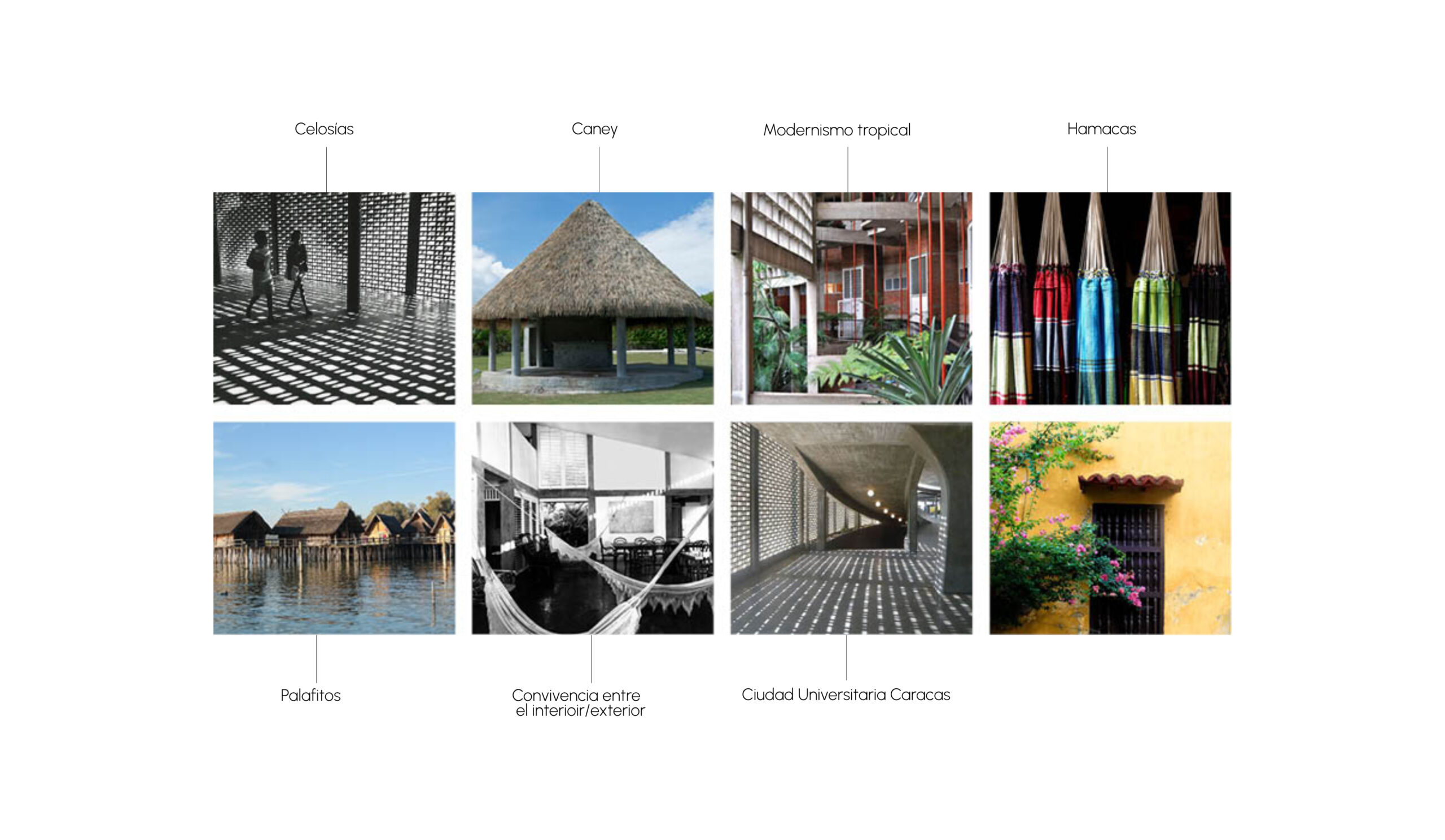 Las referencias expresan el concepto de distintas maneras: celosías que comunican frescura y ventilación, el ‘caney’ como estructura y como espacio de encuentro heredado de las comunidades indígenas aún presente en la vida cotidiana venezolana, el brutalismo de los años 60 reflejado en las universidades caraqueñas y su arquitectura, y la tradición de las hamacas, con sus tejidos reconocibles y aún vigentes en los hogares. Pueden parecer muchos conceptos a la vez, pero no se busca una representación literal de estas influencias, sino generar a partir de ellas una nueva propuesta que capture y traduzca toda su atmósfera.