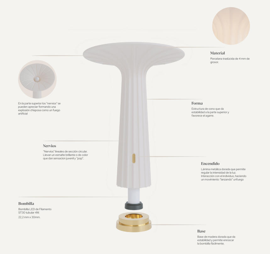 Esta propuesta tiene como briefing el diseño de una lámpara de mesa para Lladró, reflejando los valores de la marca e integrándose en su línea de iluminación. “Festive” presenta una estructura única de porcelana traslúcida que refleja la explosión y expansión de los fuegos artificiales. La forma fluida y dinámica imita la trayectoria de las chispas luminosas en el cielo nocturno. Busca generar atracción sin ostentosidad, que acompaña el entorno que decora proporcionando armonía, versatilidad estética y visual.