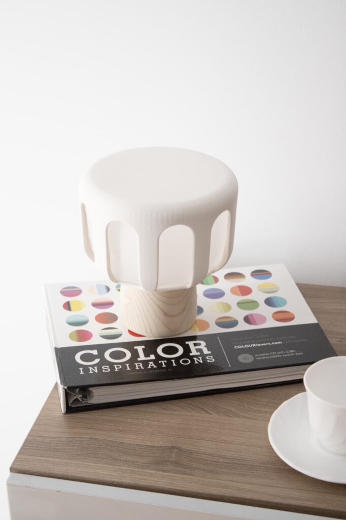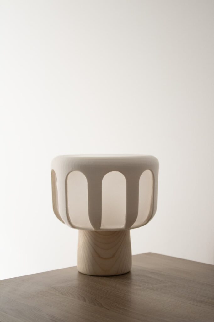 Esta lámpara busca representar el juego de luces que se encuentra dentro de la fotografía arquitectónica. La luz entra por los arcos entre columnas que se repiten. A partir de este concepto, se ha desarrollado una pieza cálida y cercana que emite la luz a través de estos arcos, en donde integrando curvas suaves y patrones armónicos, se crea un aspecto arquitectónico.